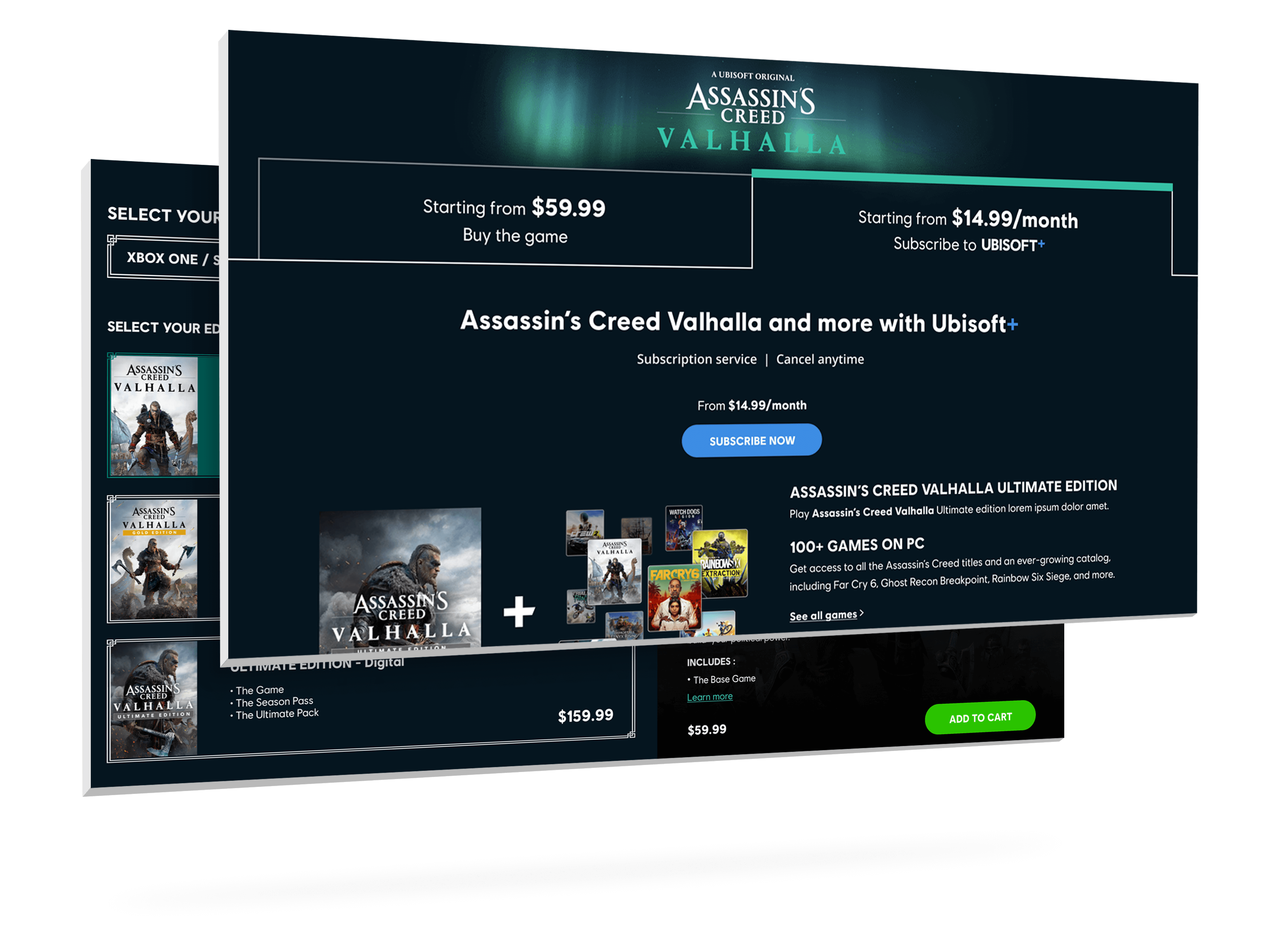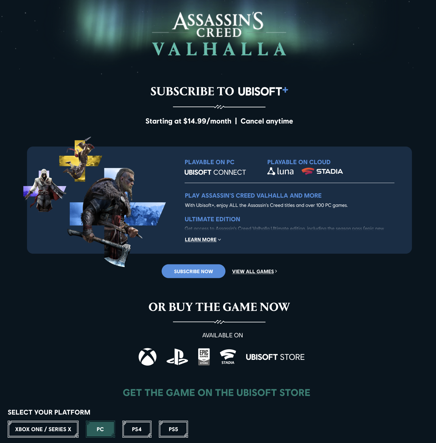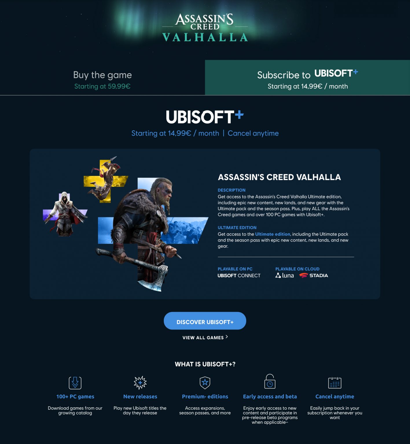 At the start of the project, the Ubisoft+ offer was only presented on the Assassin’s Creed Valhalla United States brand site. Here’s how it was integrated alongside purchase options: