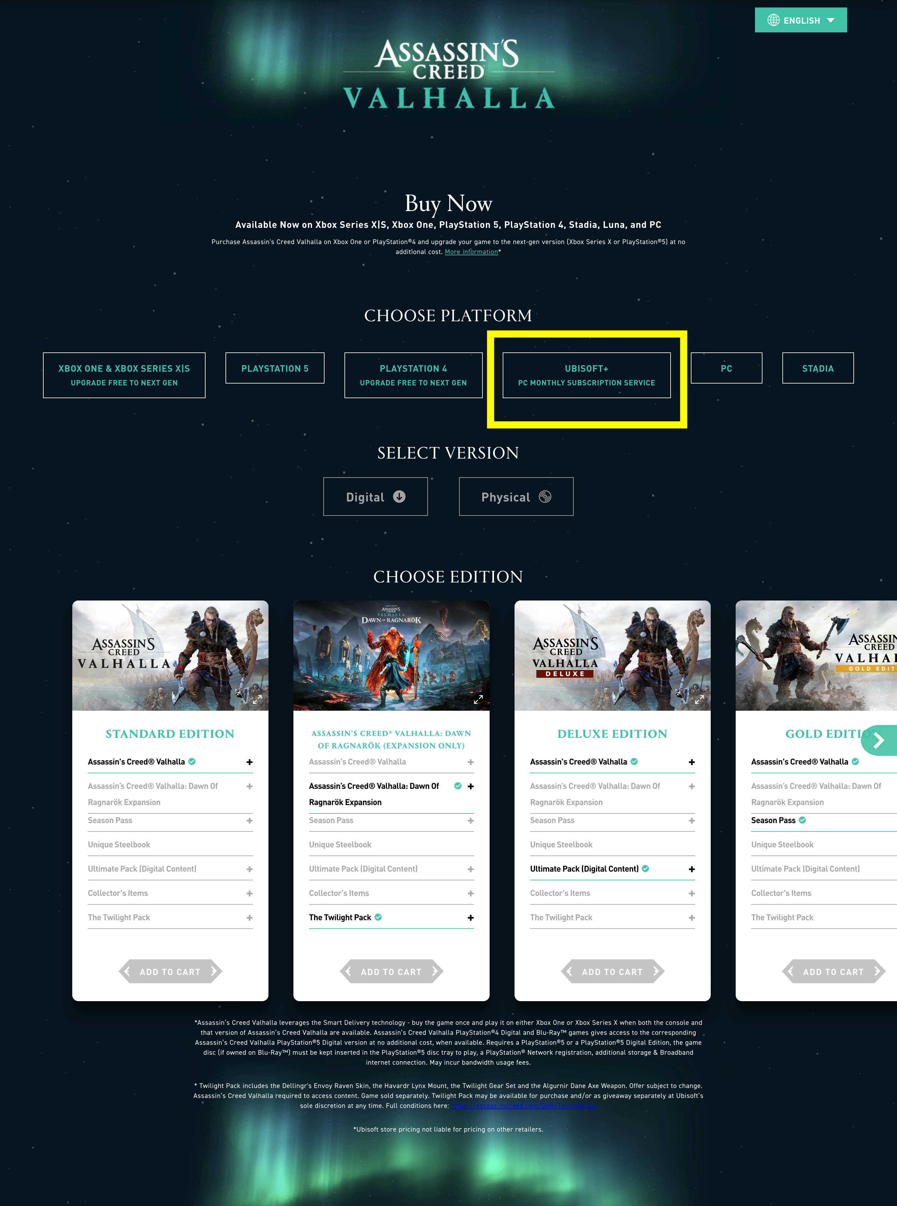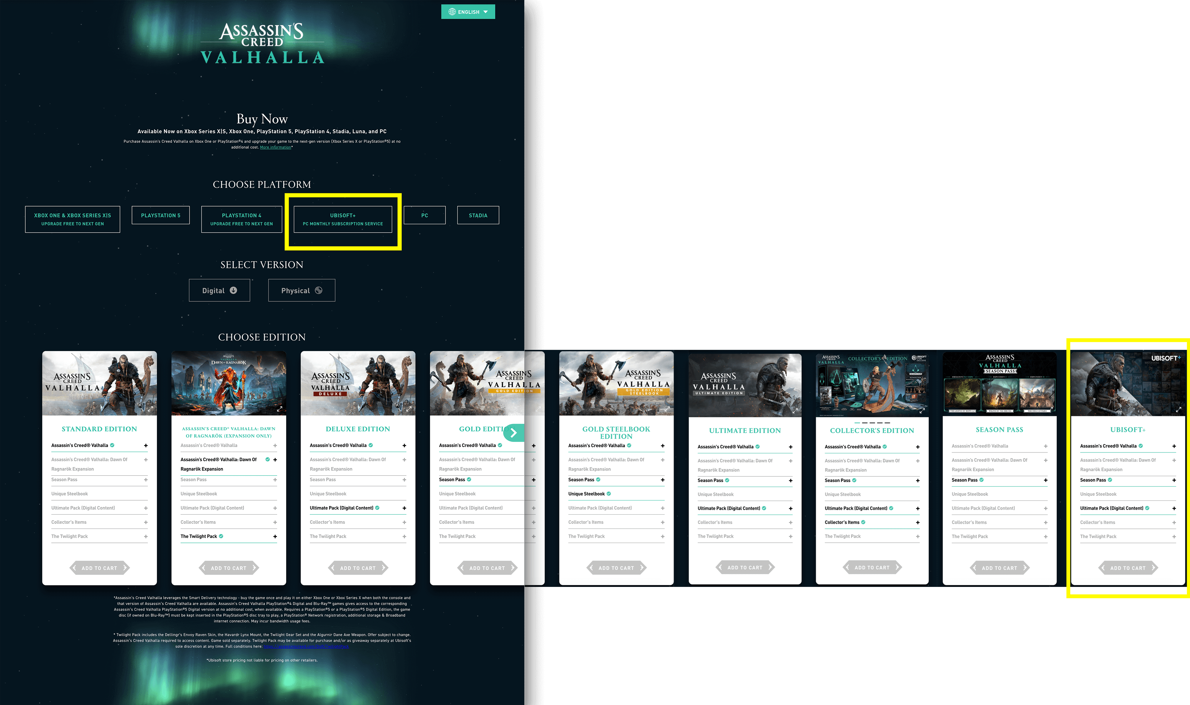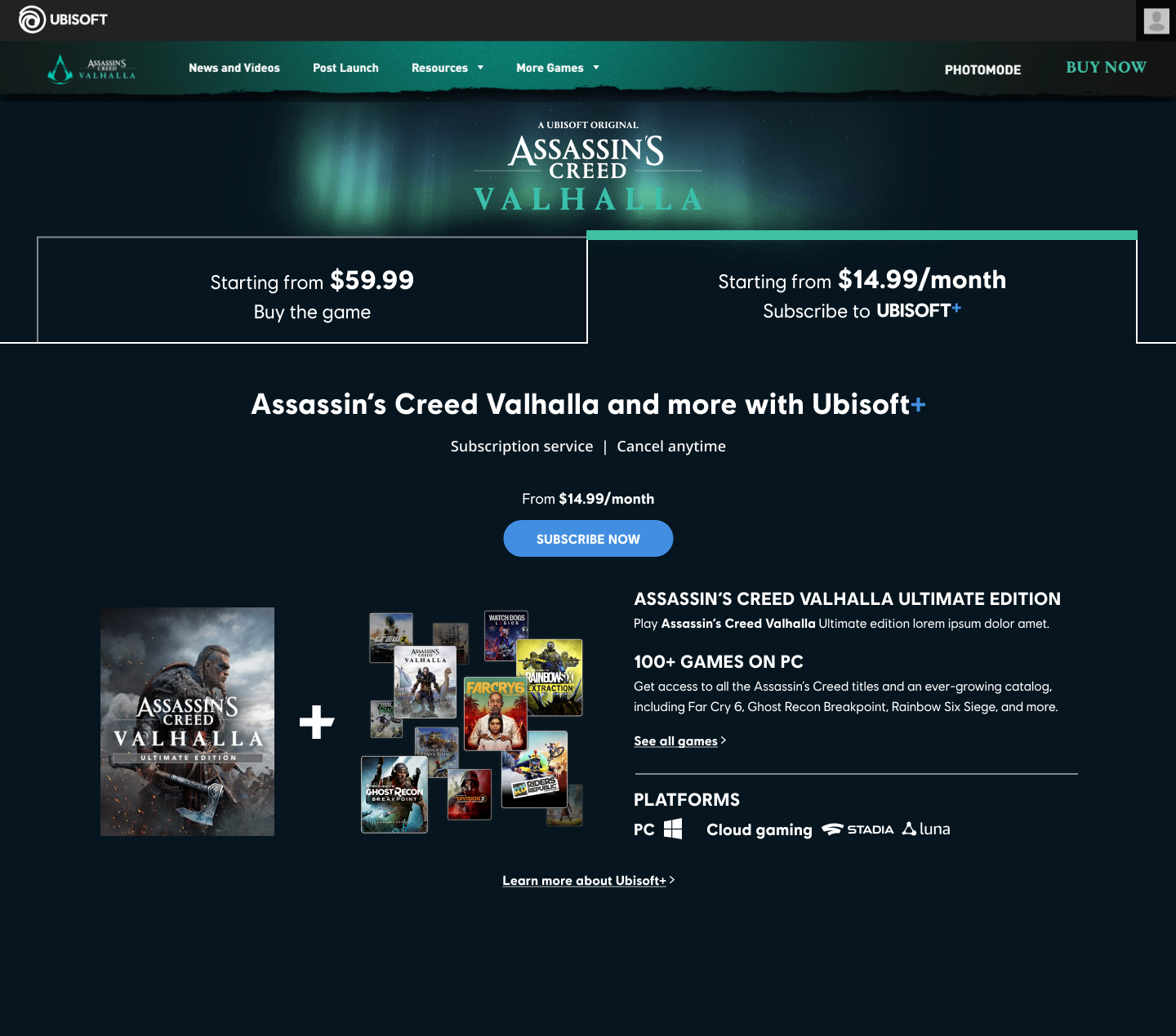 At the start of the project, the Ubisoft+ offer was only presented on the Assassin’s Creed Valhalla United States brand site. Here’s how it was integrated alongside purchase options: