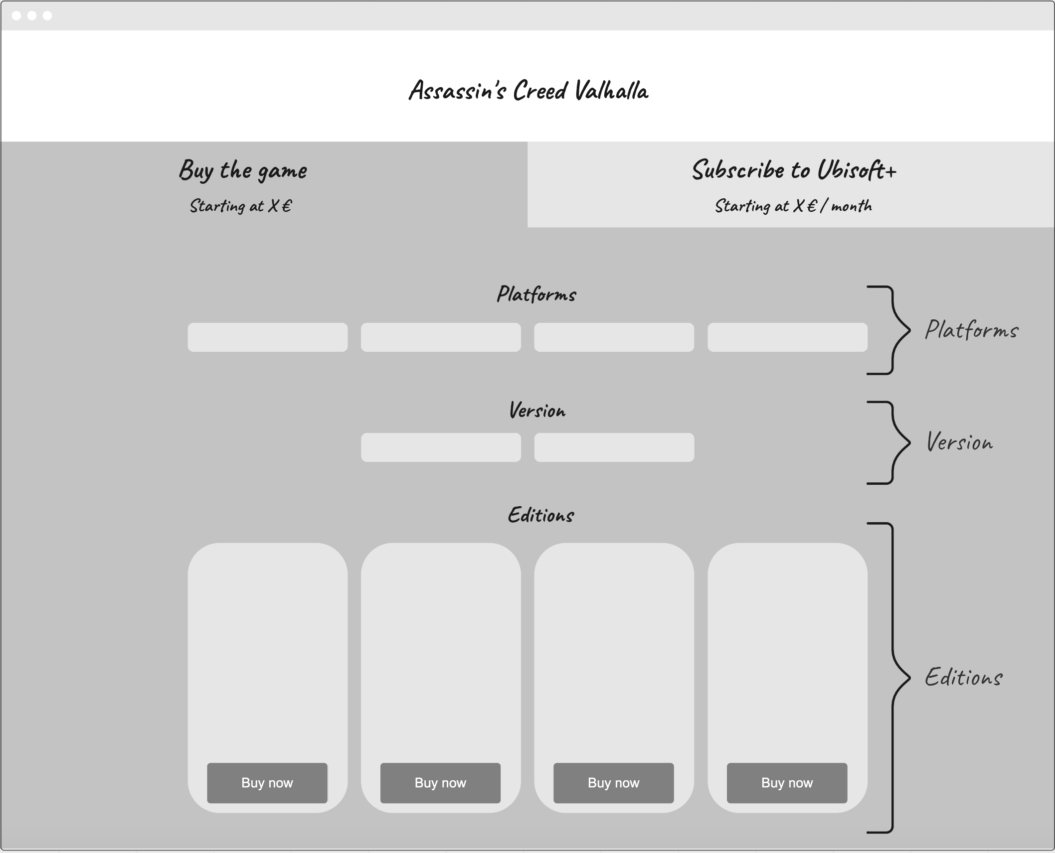 The subscription being an alternative to buying the game, I removed Ubisoft+ from the purchase module in order to create a system of tabs with the starting prices. No change for the “Buy” tab that was out of scope at the moment. Key benefits: